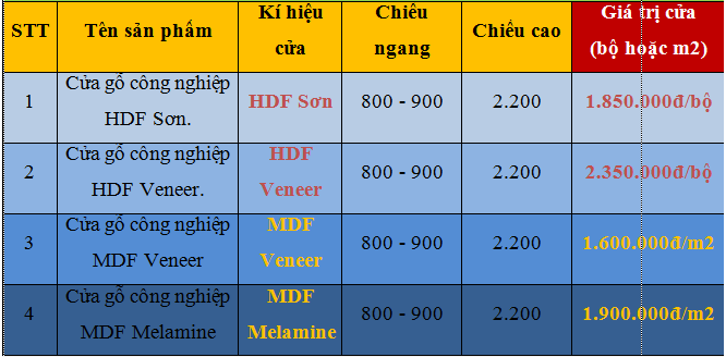 BÁO GIÁ CÁC LOẠI CỬA GỖ CÔNG NGHIỆP