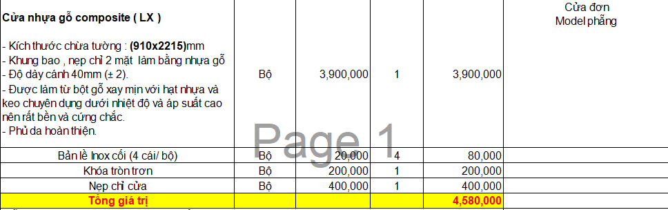 2. Bảng giá cửa nhựa Composite Sơn PU tại quận 2