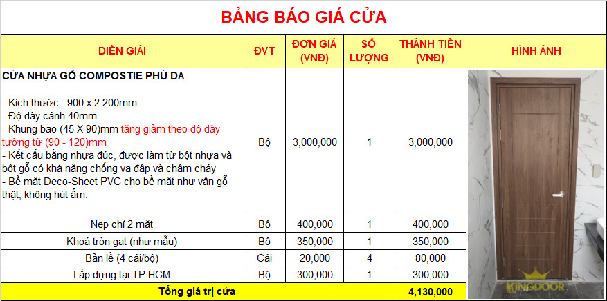 GIÁ CỬA GỖ – CỬA NHỰA – CỬA CHỐNG CHÁY MỚI NHẤT KINGDOOR
