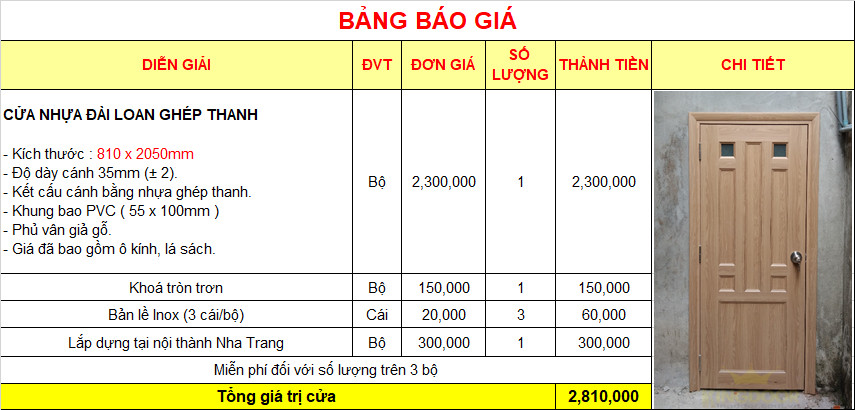 Giá cửa hoàn thiện = giá ( khung bao + cánh + nẹp chỉ 2 mặt ) + bản lề + khóa + công lắp đặt + phí vận chuyển (nếu có) + mẫu trang trí phát sinh (nếu có)