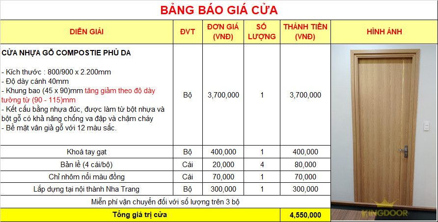(Giá tính theo bộ : bao gồm khung bao + cánh + nẹp chỉ 2 mặt) Giá : 3,500,000đ/bộ (Giá tính theo bộ : bao gồm khung bao + cánh + nẹp chỉ 2 mặt) Giá : 3,600,000đ/bộ Công lắp đặt tại nội thành Nha Trang : 300,000đ/bộ Phí vận chuyển : miễn phí đối với số lượng từ 3 bộ trở lên. Đối với số lượng ít hơn sẽ phát sinh thêm phí vận chuyển từ 200.000đ – 400.000đ/chuyến tùy vào địa điểm công trình. Bản lề ( 3 cái/bộ ) : 60,000đ/bộ Khóa các loại dao động từ 150.000đ – 750.000đ/bộ, ngoài ra Kingdoor còn cung cấp khóa điện từ Kassler Mẫu mã trang trí có ô kính, lá sách hay chạy chỉ nhôm nổi trên bề mặt : Giá sẽ được báo chi tiết theo kích thước và kiểu mẫu khách hàng yêu cầu, dao động từ 300.000đ – 800.000đ. Mẫu có ofix kính hoặc ván ( hay còn gọi là ô thoáng ), dao động từ 1.000.000đ – 1.500.000đ Cục hít chặn cửa : 50.000đ/bộ Mắt thần : 50.000đ/bộ Chốt an toàn : 100.000đ/bộ Giá cửa hoàn thiện = giá ( khung bao + cánh + nẹp chỉ 2 mặt ) + bản lề + khóa + công lắp đặt + phí vận chuyển (nếu có) + mẫu trang trí phát sinh (nếu có) Ví dụ: Khung bao chuẩn : 45 x 90mm . ( Tăng giảm linh động từ 90 – 115mm, ngoài ra còn có hệ khung 55 x 105mm và hệ khung 45 x 120mm, tăng giảm linh động phù hợp với những độ dày tường to hơn ) Độ dày cánh : 40mm Nẹp chỉ : 50 x 10 mm Trọng lượng : 45 – 48kg Bề mặt có 3 loại lớp phủ : phủ da, sơn Pu, Luxury 👉 Cửa nhựa gỗ Composite được đúc nguyên tấm, đóng mở chắc chắn có độ đầm tay, cửa chịu lực cao. 👉 Chống nước, chống cong vênh. Khả năng cách âm, cách nhiệt tốt. 👉 Đa dạng hệ khung, phù hợp với nhiều kích cỡ tường. 👉 Phù hợp với nhiều vị trí từ nhà ở đến các công trình xã hội. Và đây cũng đang là sản phẩm hót được ứng dụng rộng rãi, làm cửa phòng, cửa nhà vệ sinh, cửa chính chung cư, cửa văn phòng, nhà máy,… Hướng dẫn lắp đặt cửa nhựa Composite